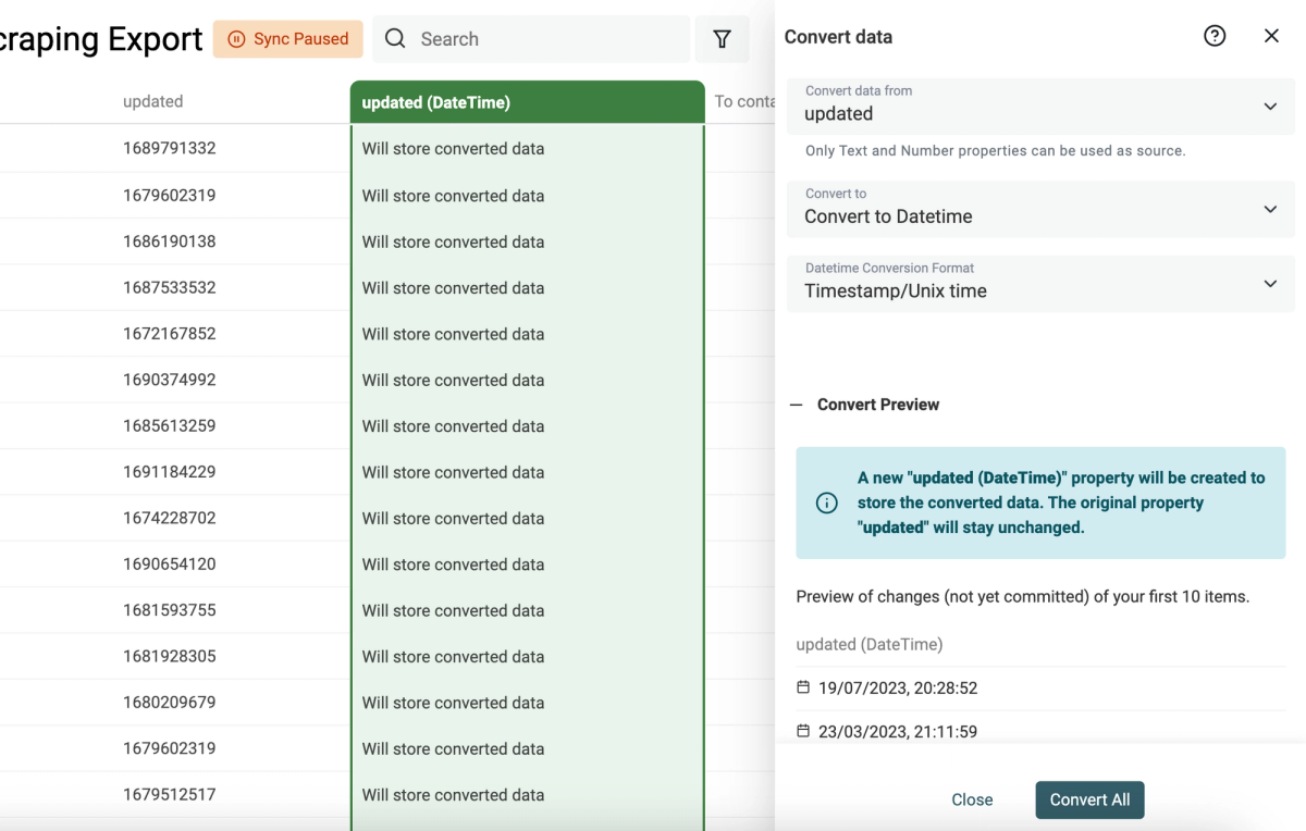 A new data type conversion is available to get a Datetime from a Unix timestamp. A timestamp is a way to represent a date using the number of seconds from the Unix Epoch on January 1st, 1970 at UTC. Datablist detects timestamps in seconds or milliseconds and returns a formatted Datetime.