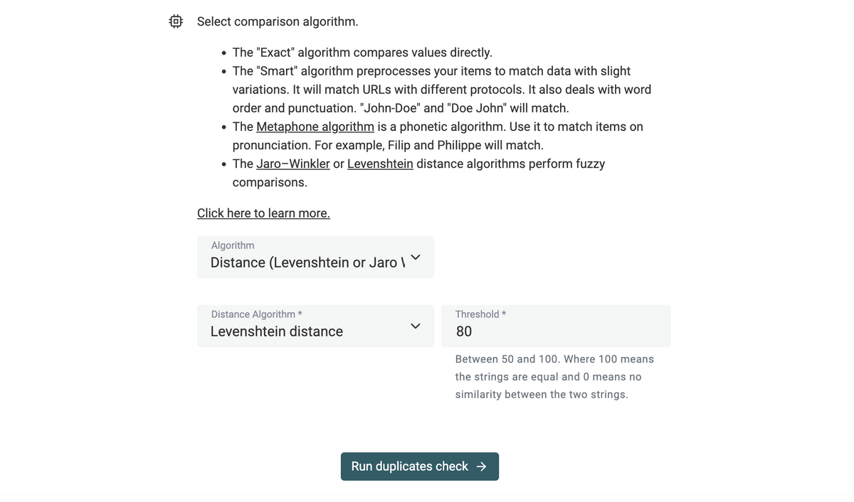 Datablist Duplicates Finder is getting better with fuzzy matching. Fuzzy comparisons work by calculating the similarity between two strings with a distance function. And a threshold lets you decide when the strings must be considered similar.