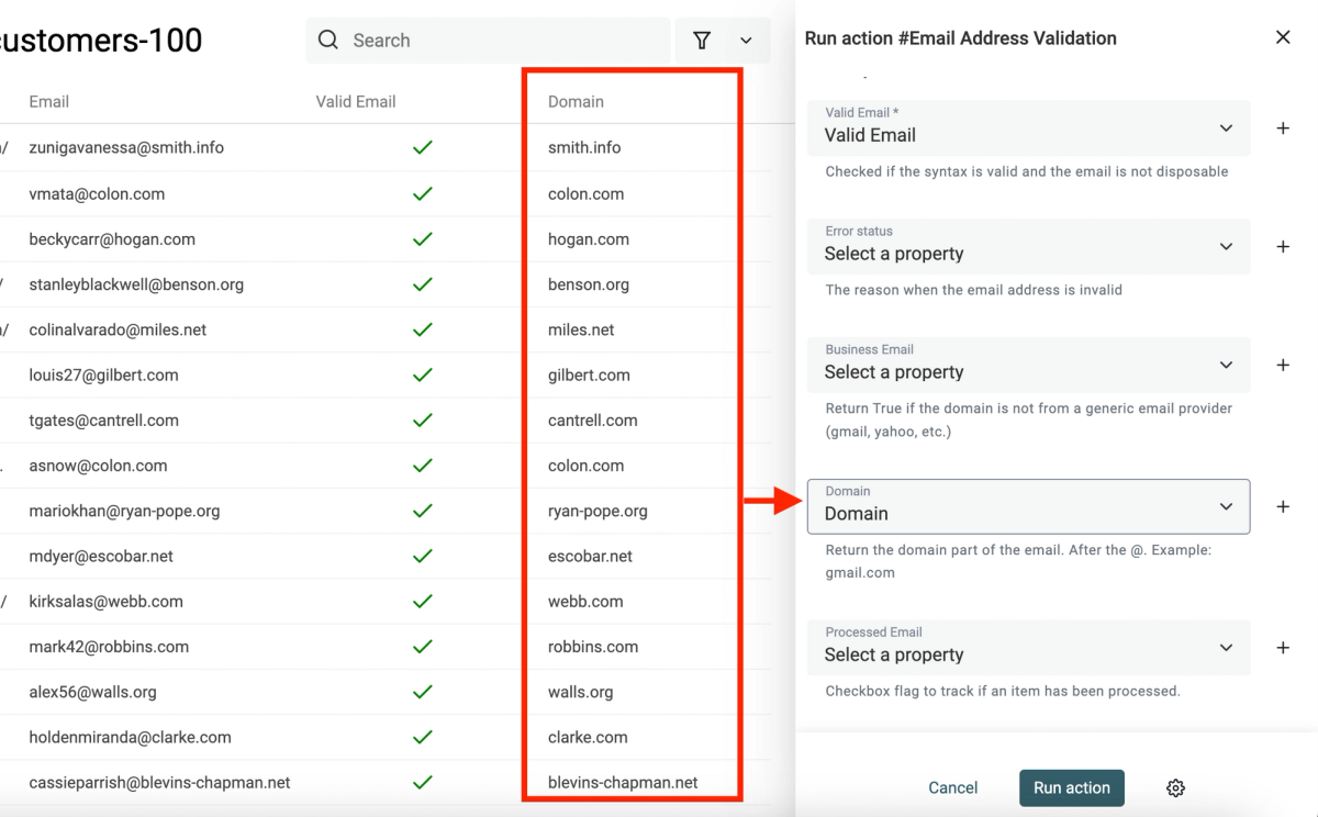 Datablist free email validation service now returns the domain from the list of email addresses.