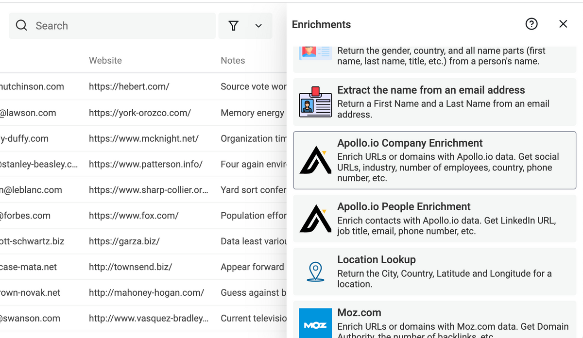 In addition to the Apollo.io People Enrichment, Datablist now has an enrichment for company data using the Apollo.io API.