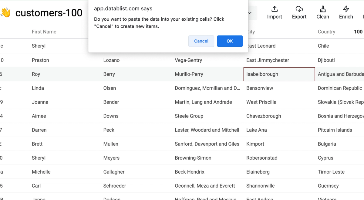 For now, it only works when the pasted data has one column. Datablist shows a confirmation dialog to know if it must create new items or edit the current cells.