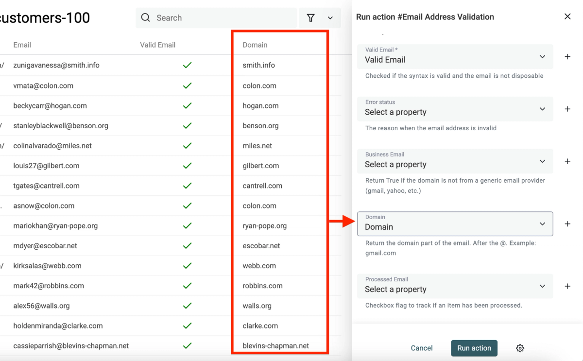 - Domain – Return the domain part of the email. After the @. Example: gmail.com