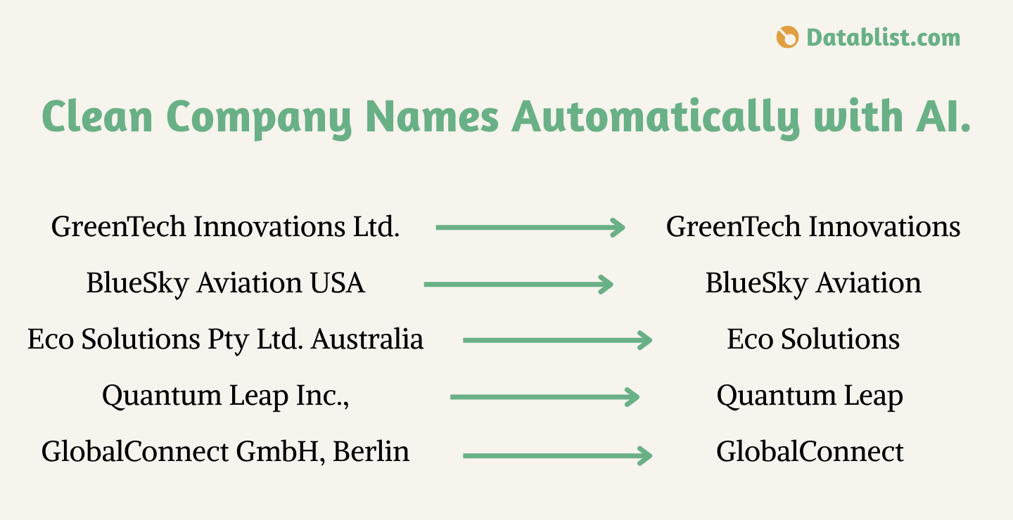 Clean and normalize complex data like company names by removing legal suffixes (LLC, Inc.) or standardizing job titles and addresses.