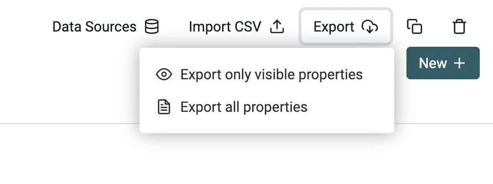 Collection properties can be hidden on the listing view. When exporting your collection to CSV, when at least one property is hidden, you can choose between two export options: