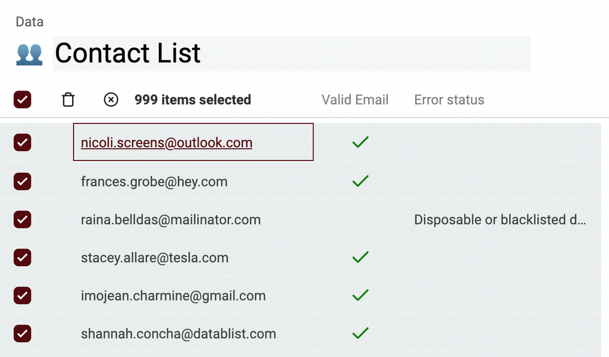 Performing an email list cleaning on Datablist is now simple. Just select the email addresses in your collection and run the "Email Address Validation" action.