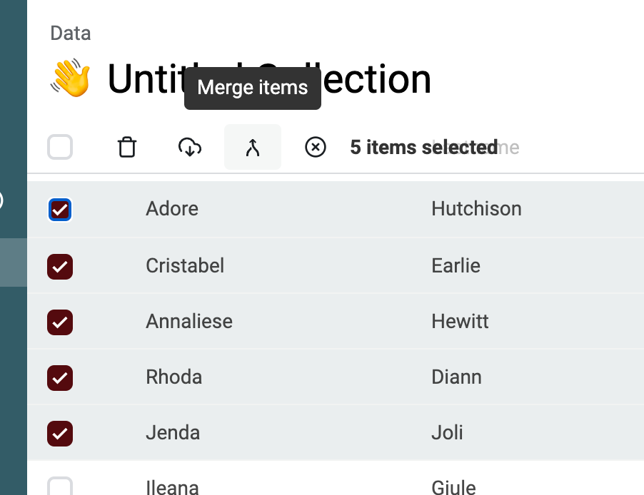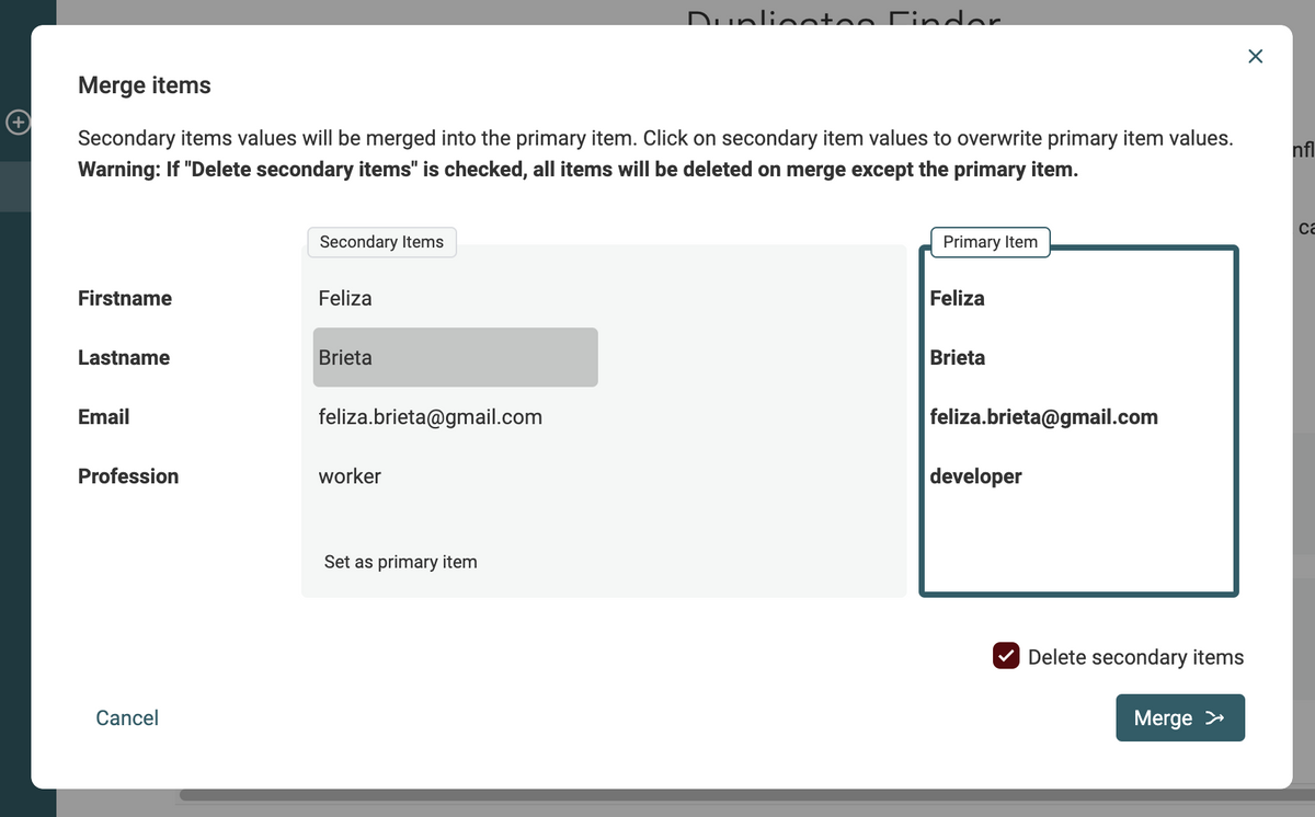 For items with conflicting values found with Datablist Duplicates Finder or to merge items directly from a collection, we introduce a Merging Assistant.