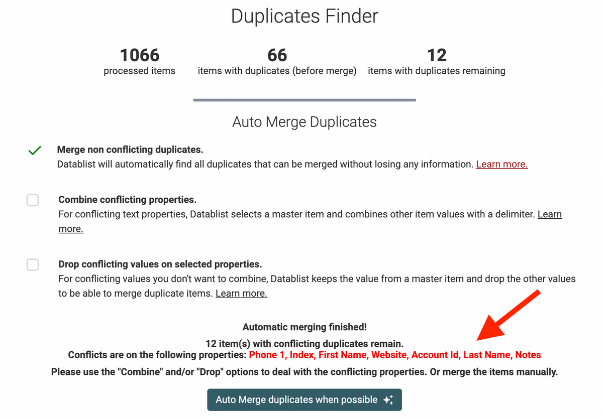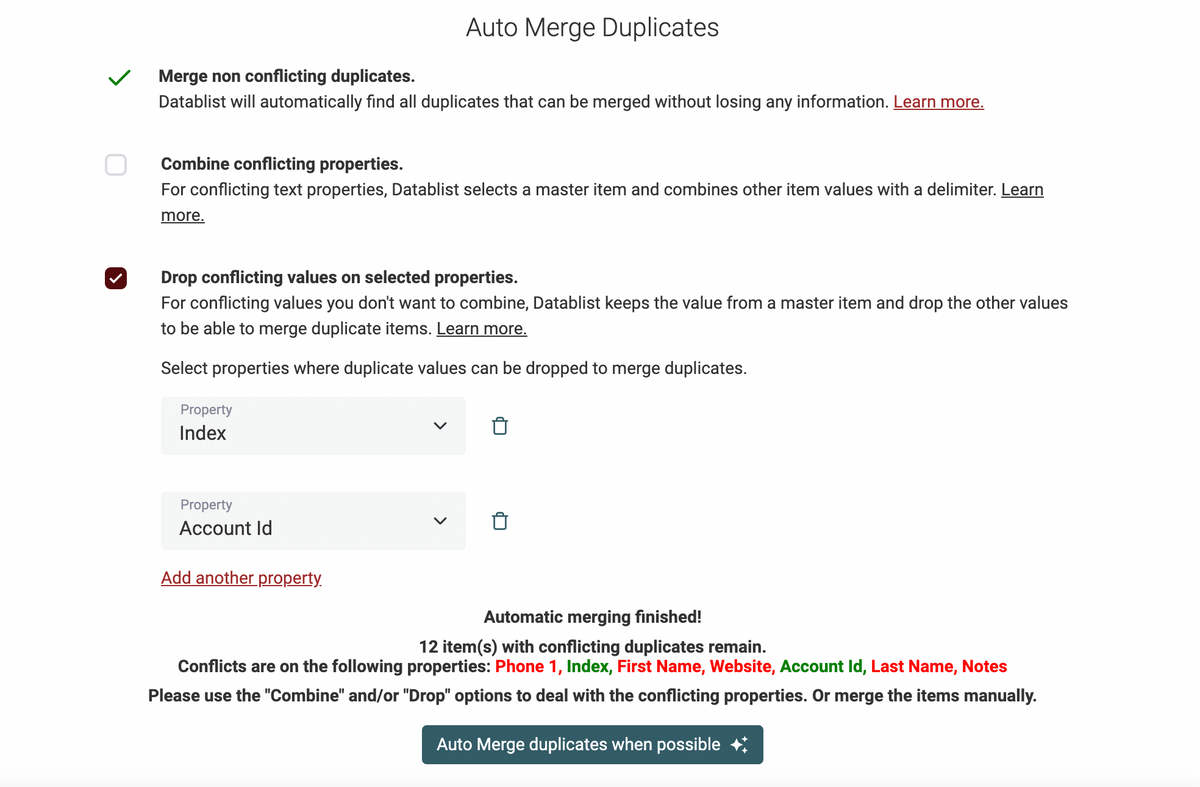 - Drop conflicting properties - With this option, only the value from a master item will be kept during the duplicate items merging. This is useful for technical properties. If your "Contacts" have an "Id", "Created On", or "Last Modified" property, you don't need to combine them. You only want to keep the values from one item. At the moment, the primary item is the one with the most data. In the future, you will be able to define rules to select your primary item.