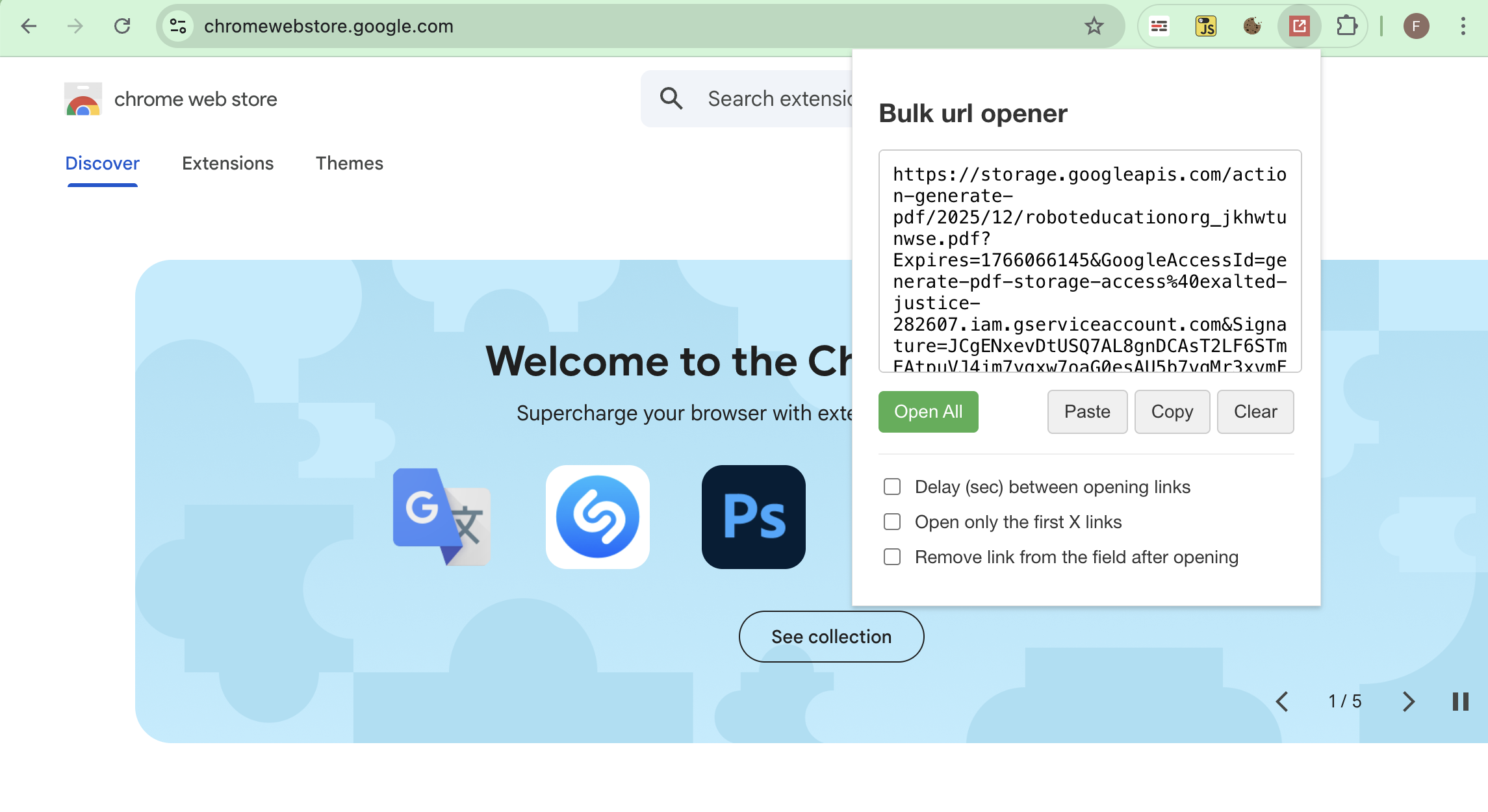 Paste the links into the Chrome Extension and click "Open All". The extension will download the PDF files to your default Downloads folder.