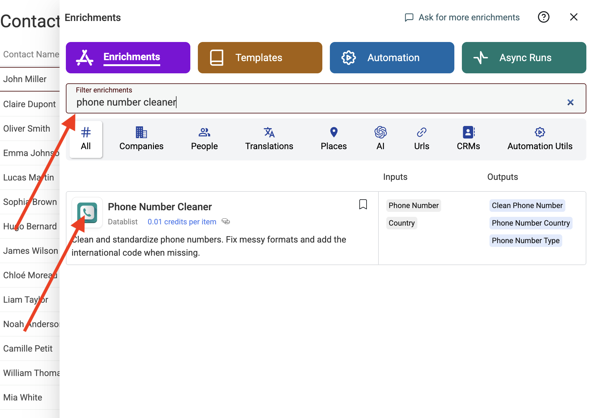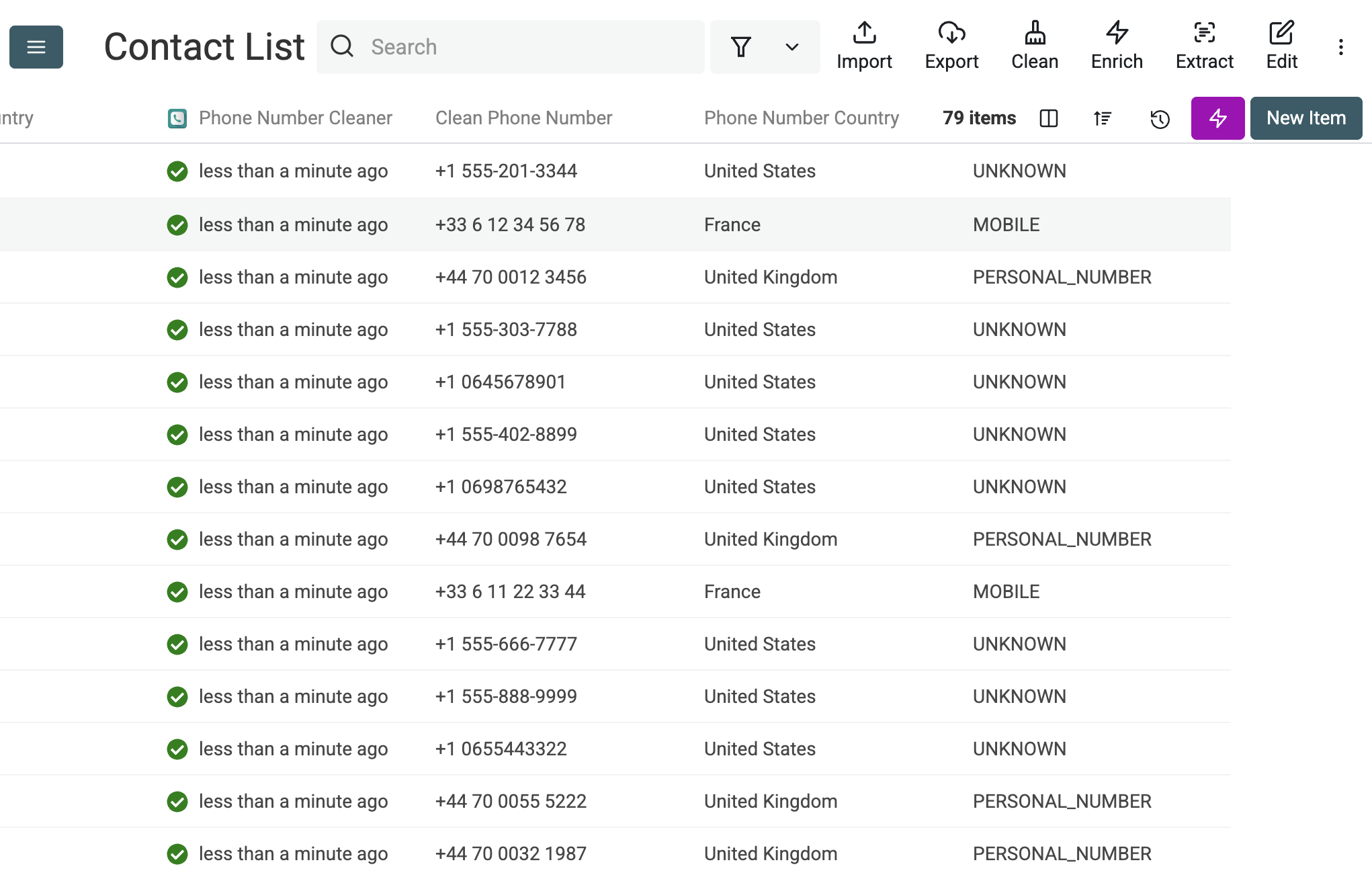 This enrichment is highly efficient. Cleaning a phone number costs 0.01 credits.