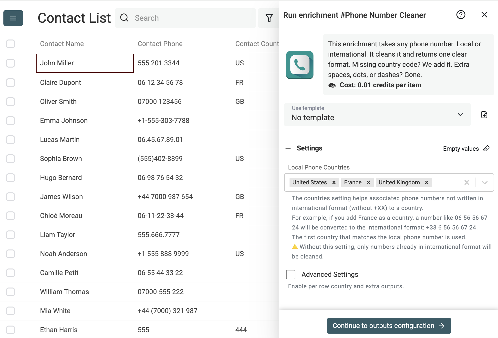 This setting is critical. Select the countries where your contacts are located. The tool uses this to fix local numbers missing their international prefix (like turning 06 12 34... into +33 6 12... for France).