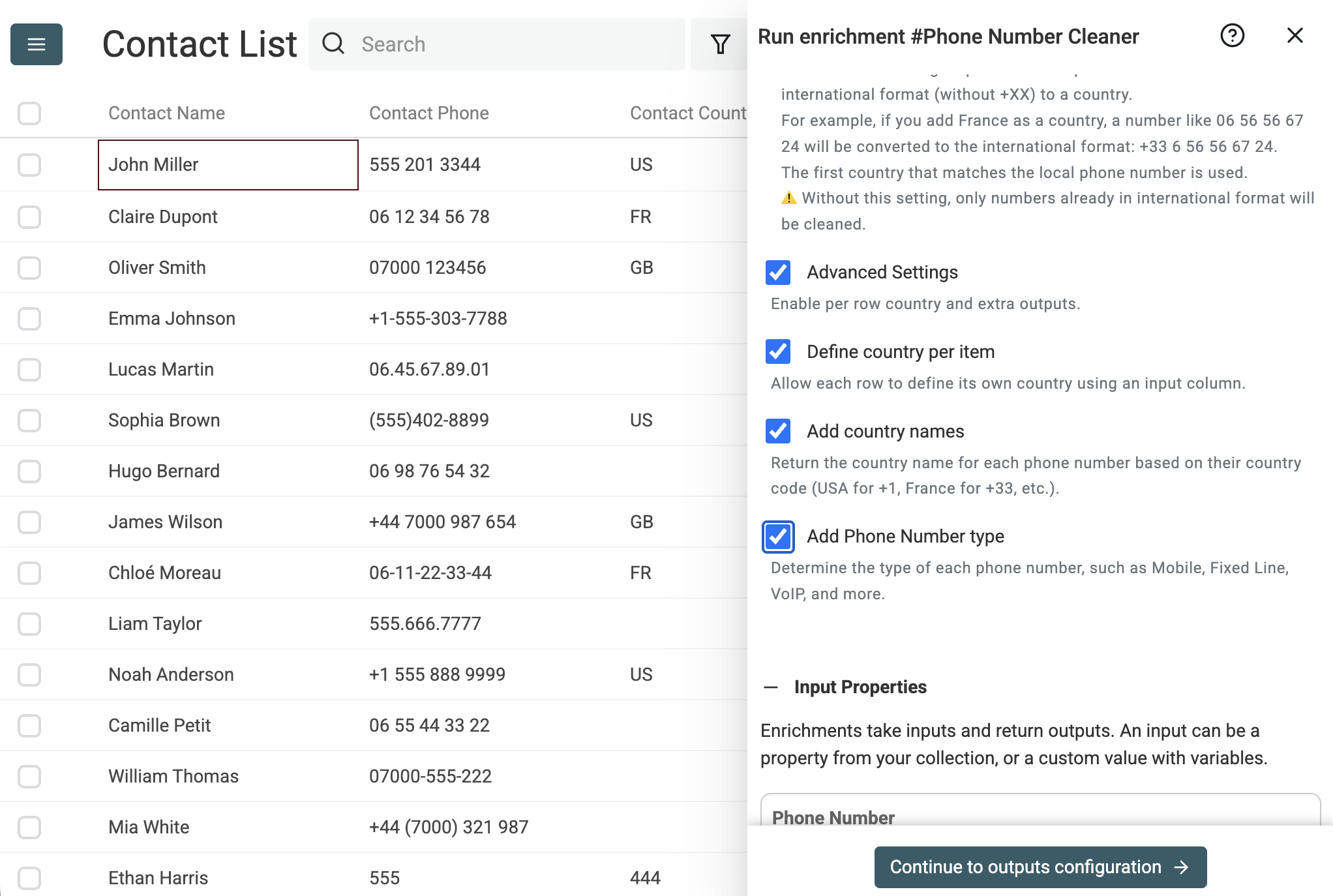 Toggle Add country name and Add phone number type. This extracts the country of origin and identifies if the number is Mobile, Fixed Line, or VoIP.