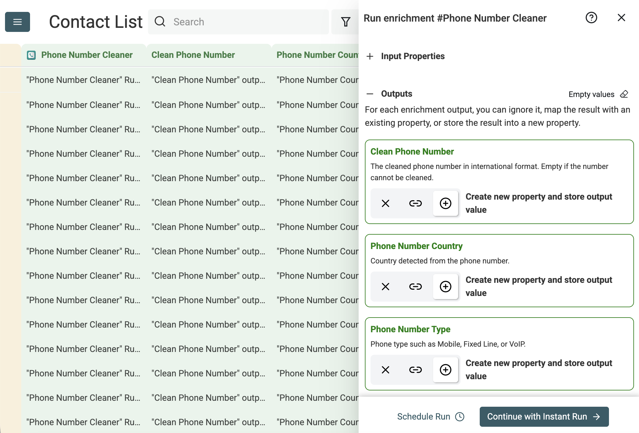Choose where to save the results. You can create new columns for the Clean Phone Number, Phone Number Country, and Phone Number Type.