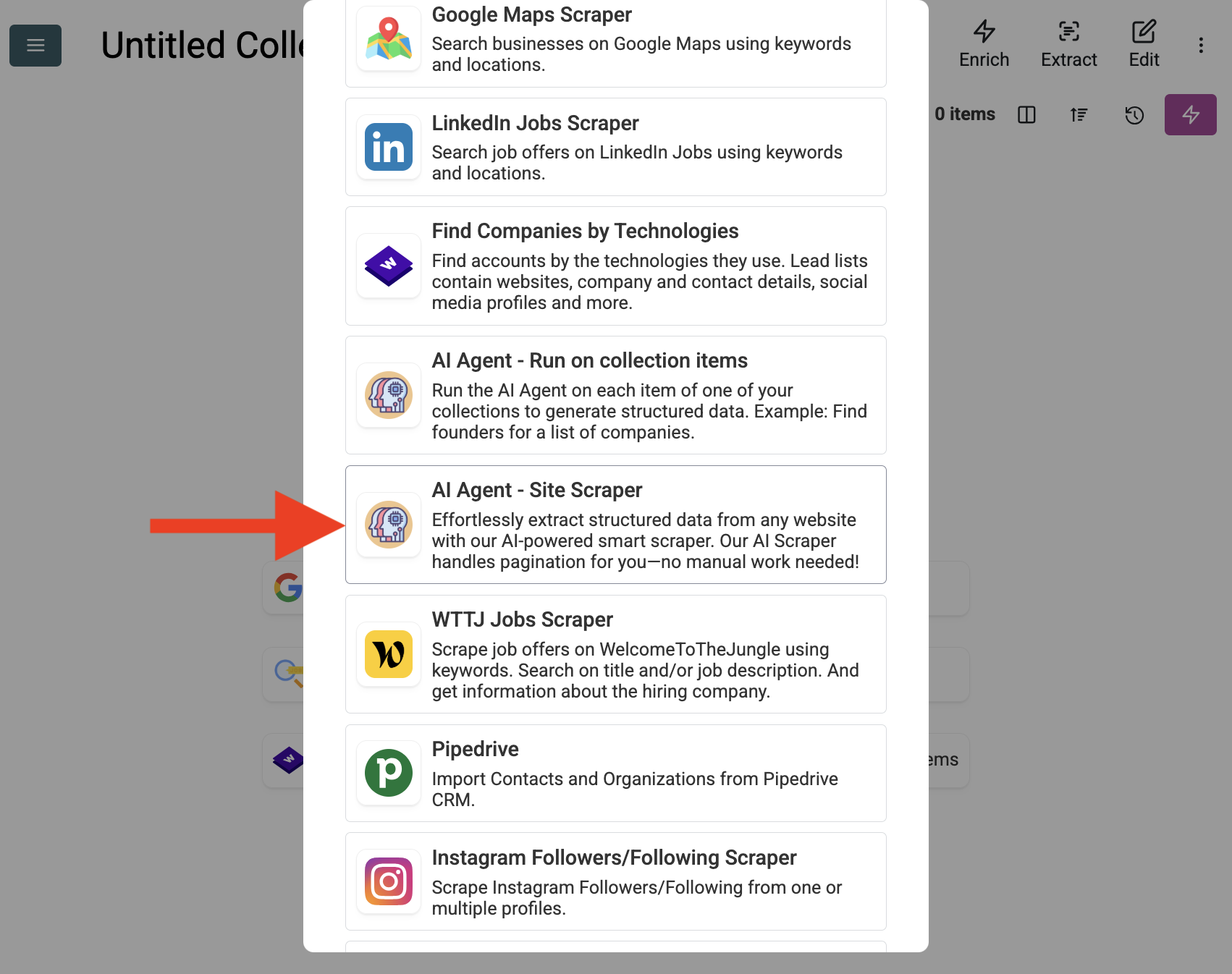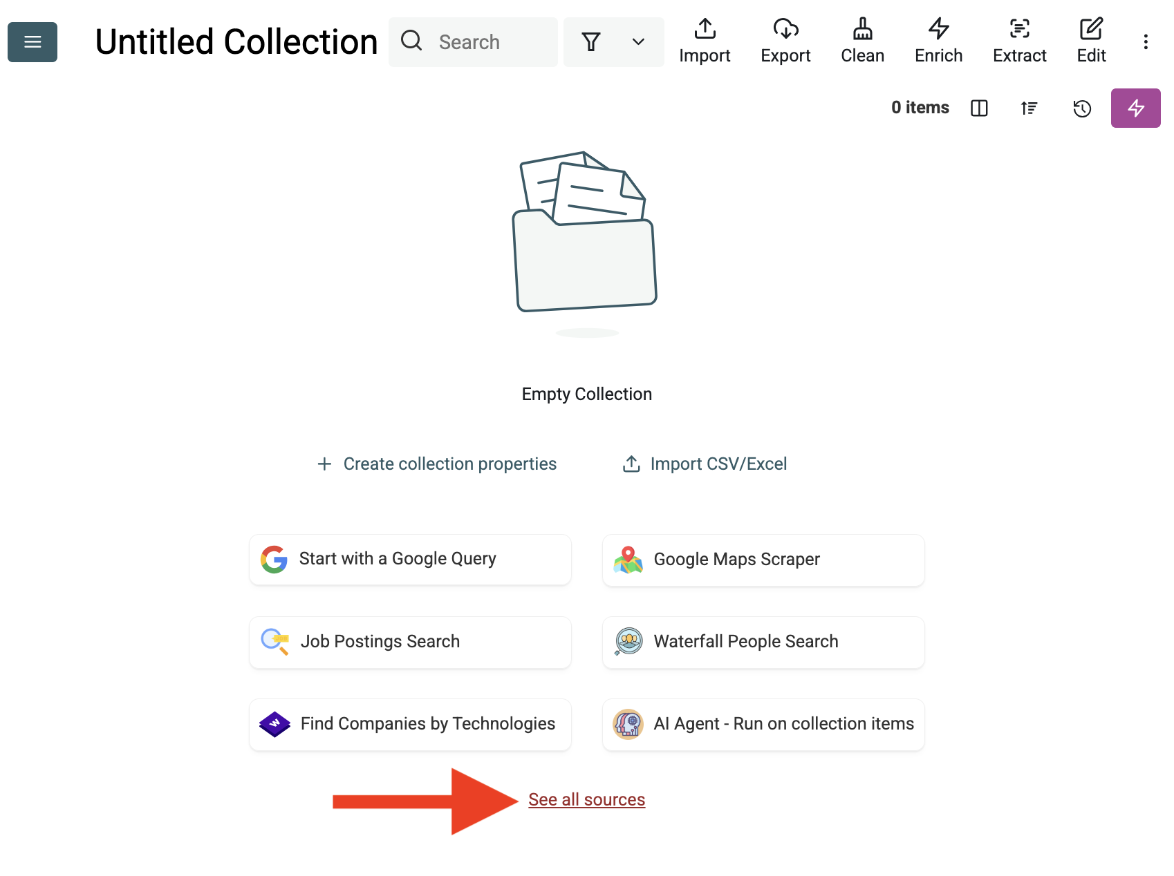 - Select the AI Agent Source: Haga clic en "See all sources" o vaya a "Import" -> "Import From Data Sources". Elija "AI Agent - Site Scraper".