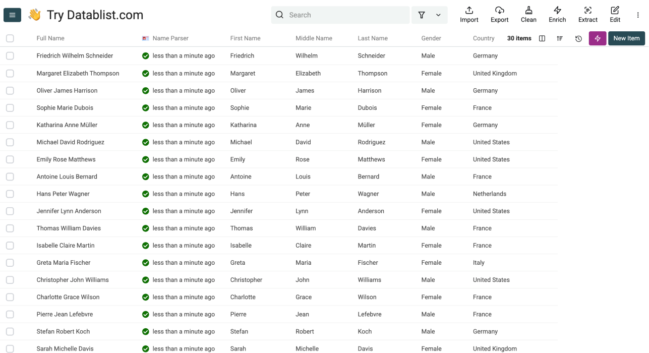 Solución 2: Use el Name Parser de Datablist para separar nombres sin fórmulas. Además extrae segundo nombre, género y país de origen.