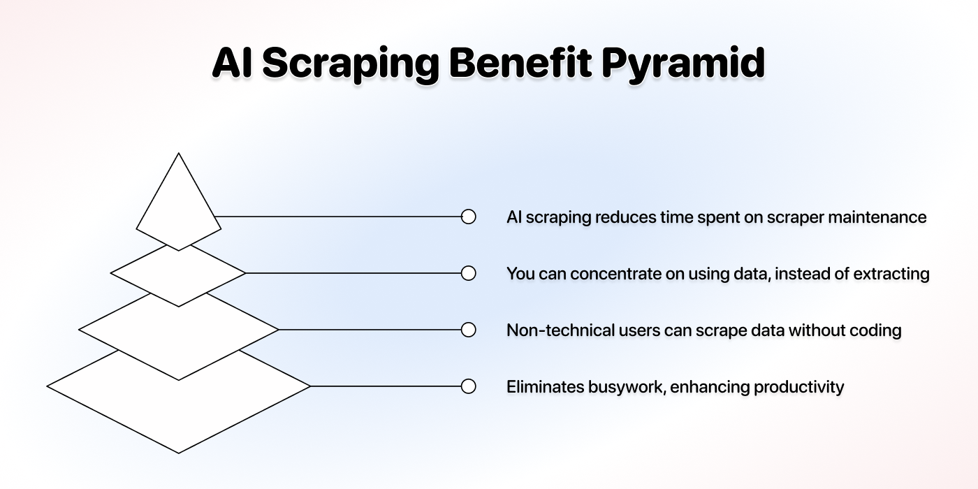Los scrapers tradicionales se rompen constantemente. Los scrapers con IA se adaptan automáticamente. Esto ahorra cientos de horas a quien ejecuta scrapers con regularidad. No es hype; es tiempo medible ahorrado.