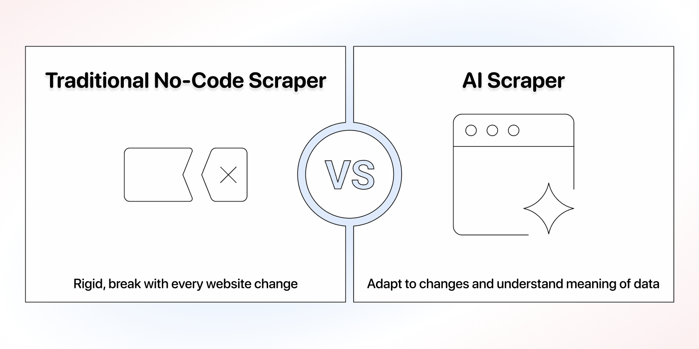 Eso es exactamente lo que le está pasando al no-code scraping tradicional ahora que existe el scraping con IA.
