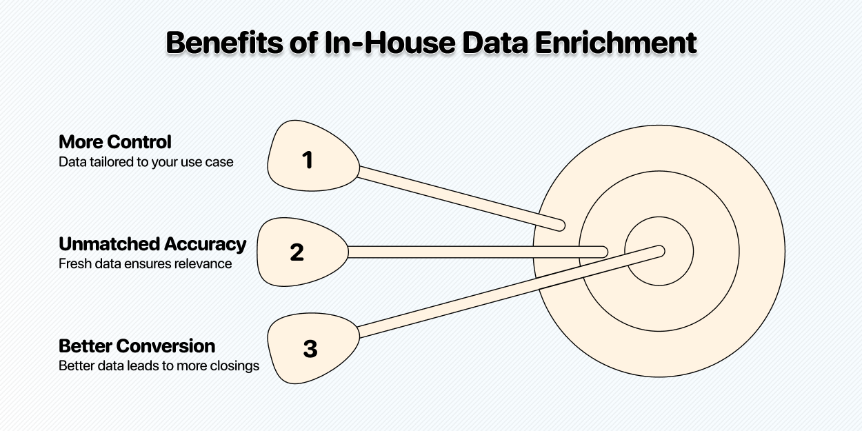 Les données B2B ne sont puissantes qu’appliquées au bon contexte. Si votre dataset n’est pas adapté à votre ICP ou à votre process commercial, vous aurez du mal à en tirer de la valeur. Construire votre propre processus d’enrichissement garantit que chaque point de donnée sert vos objectifs.