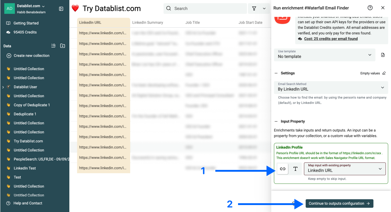 Solution : Utiliser le Datablist Waterfall Email Enrichment, qui permet de trouver des emails avec une simple URL de profil LinkedIn.