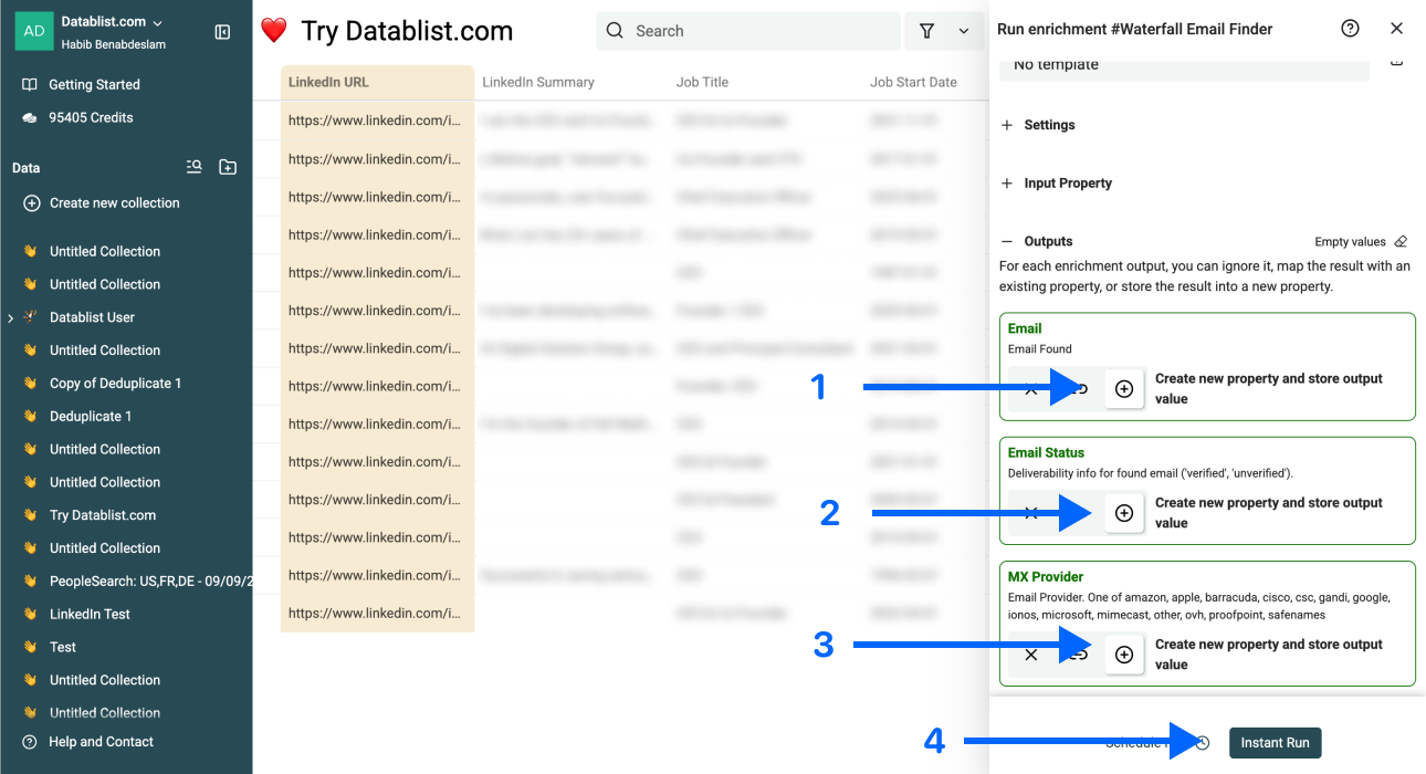 C’est possible avec Datablist. Uploadez votre liste d’URLs de profils LinkedIn, allez sur l’enrichment Waterfall Email Finder, choisissez "By LinkedIn URL" comme méthode de recherche, mappez vos URLs comme entrée, puis lancez l’enrichment. Le tout prend moins de 3 minutes et vous récupérez l’email, son statut de délivrabilité et le MX provider.