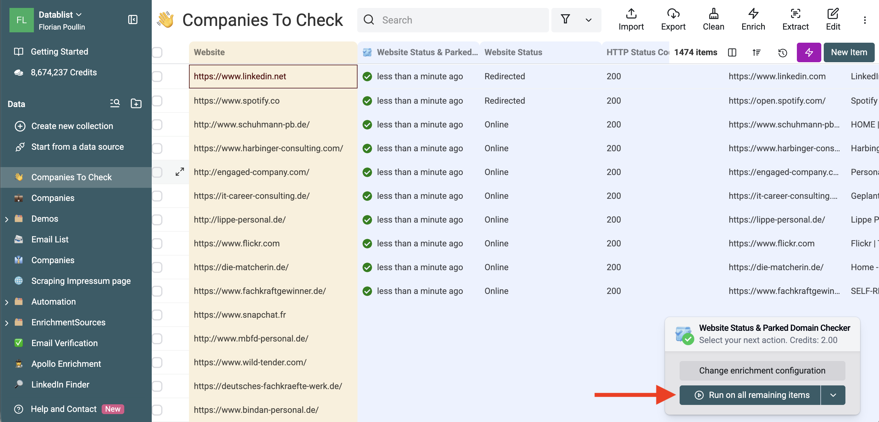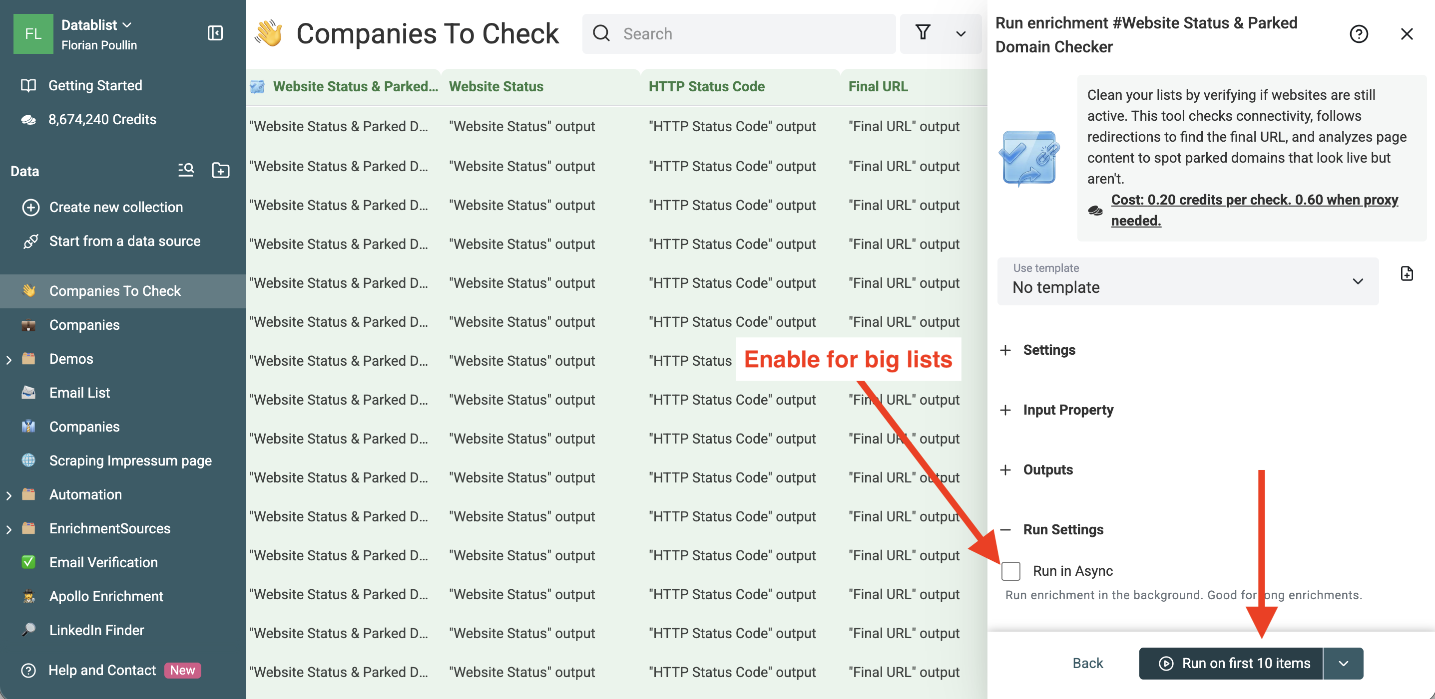 Once you verify the sample, click "Run on remaining items". For large lists, enable the "Run in Async" mode. This allows the process to run in the background while you perform other tasks. You can even close your browser, the check will continue on our servers.