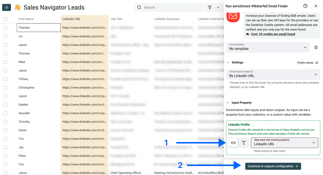 Now you should map the LinkedIn profile URLs in your collection as Input Property and click on Continue to outputs configuration