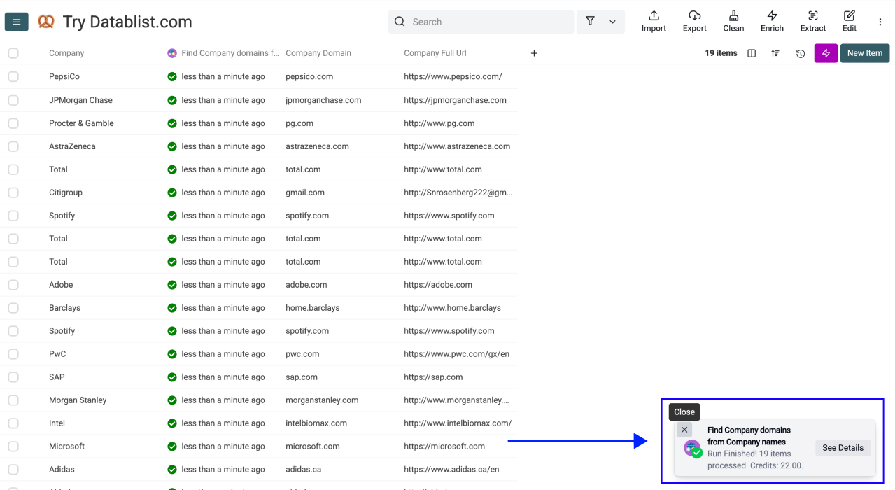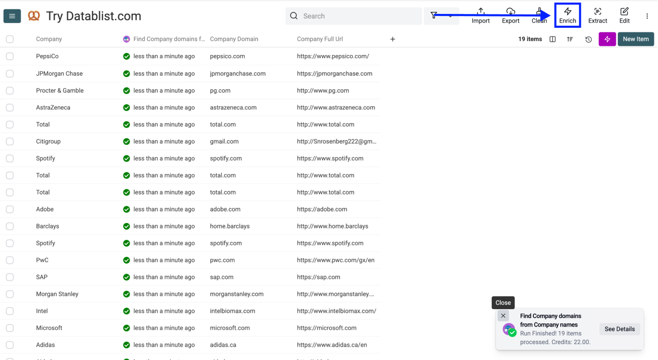 Within minutes, you'll have company domains ready for the next step. Now you can use these domains to enrich company data with the full company record.