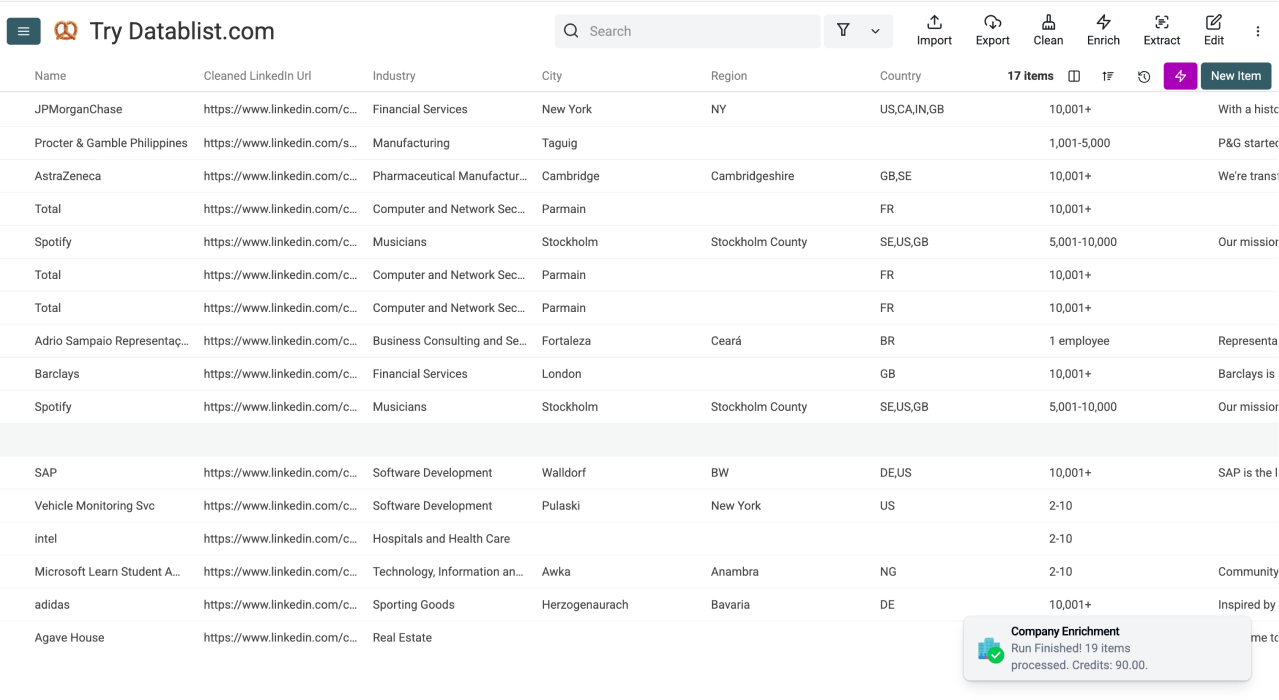 To enrich company data means to take a basic company record (like just a company name) and add missing information to it: industry, employee count, location, LinkedIn URL, and more. It's the process of turning incomplete data into complete, usable records for your lead lists.