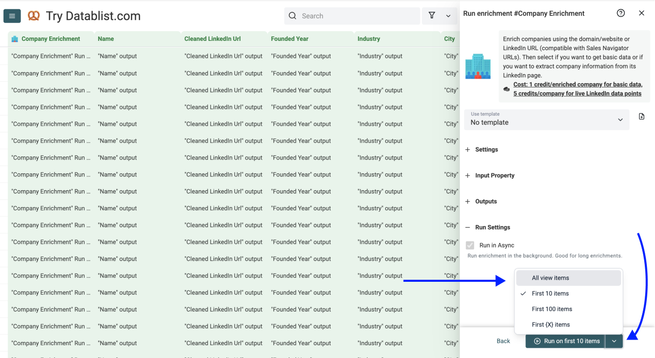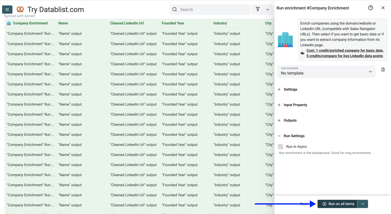 - Data to Return - Choose "Basic data" (1 credit) for industry, location, employees, and founded year, or “Scrape LinkedIn Data" (5 credits) for live LinkedIn data points