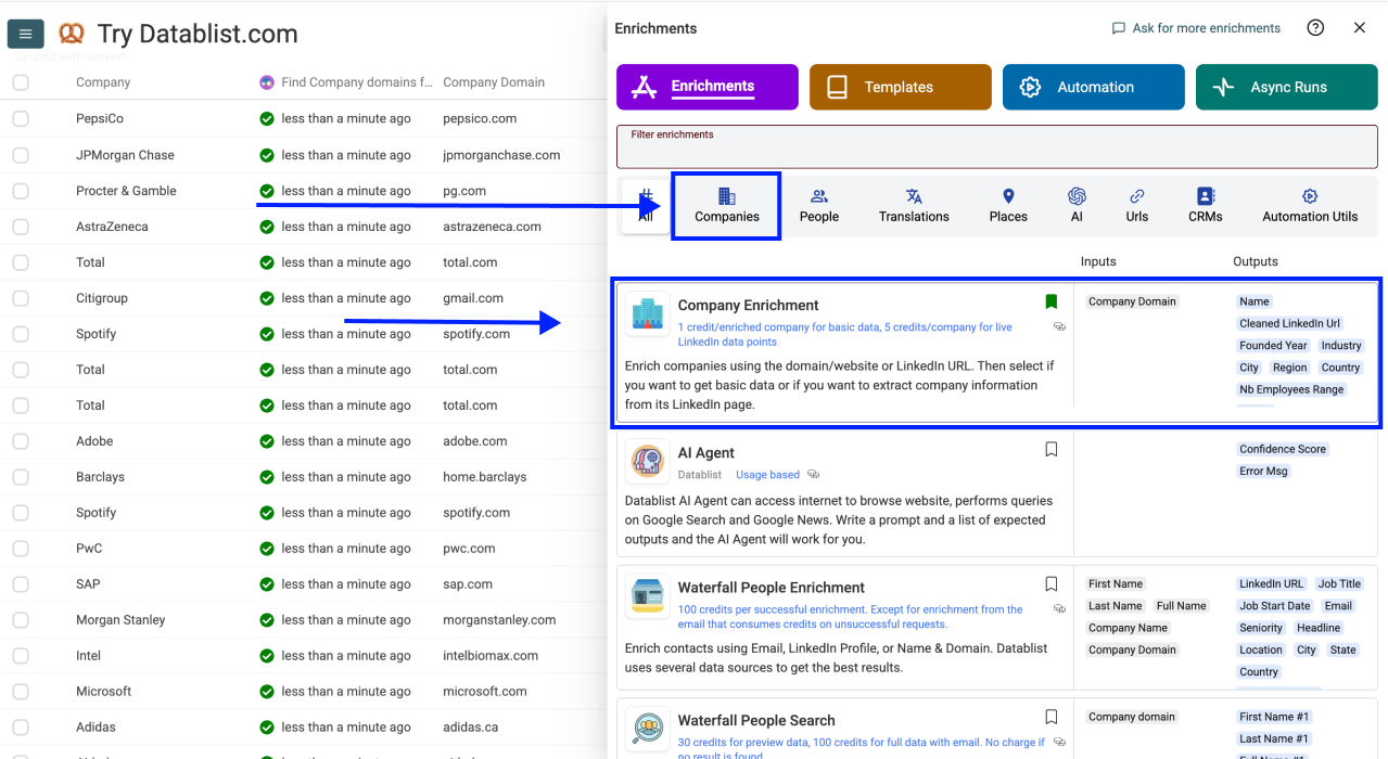 This article shows how to enrich company data from company names using two company enrichments in Datablist.