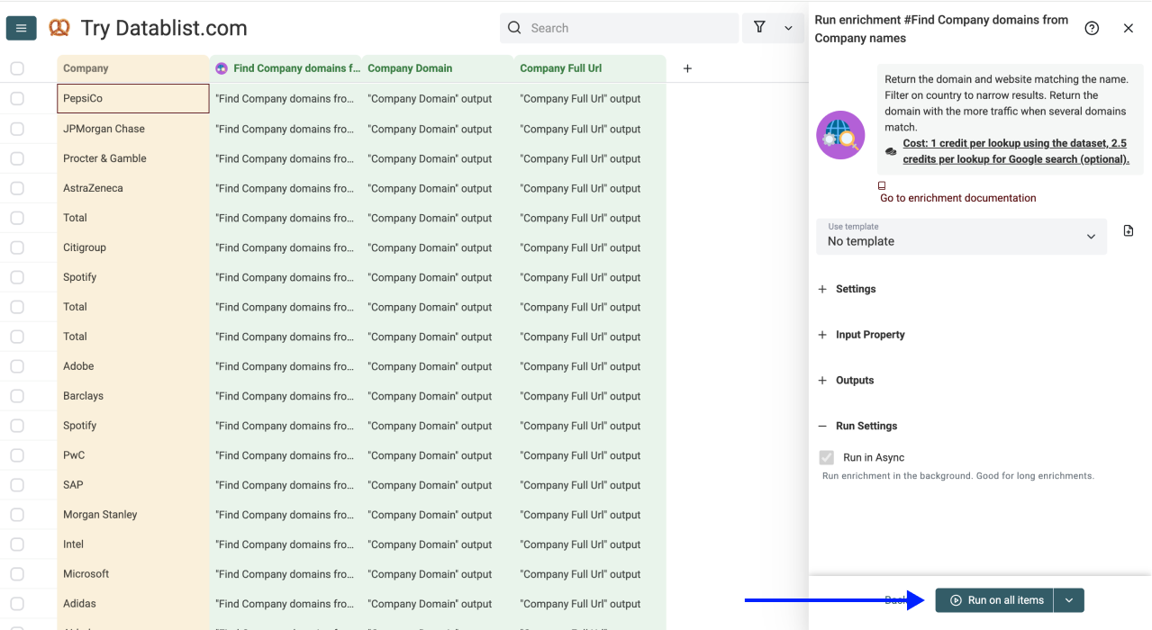 This enrichment takes your company names and finds the matching company website. It costs between 1 and 2.5 credits per company, depending on the search method you choose.