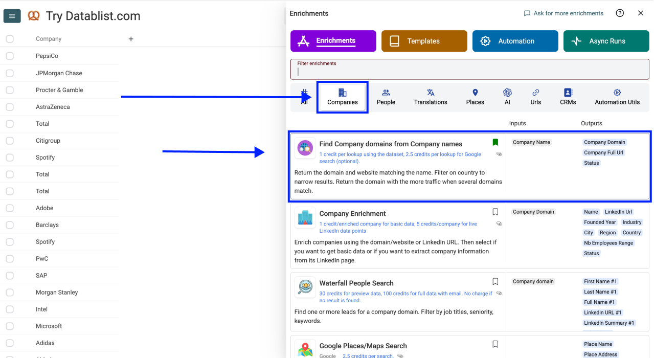 Solution: Use Datablist's Website Finder to get company domains, then run the Company Enrichment to get the full company record.