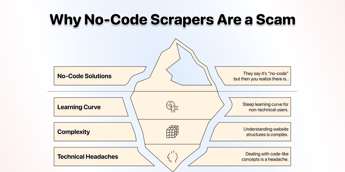 This section is all about debunking the myths and tricks of the no-code scraping industry. The truth is, most "no-code" tools aren't really no-code at all. They just repackaged technical complexity into a slightly different format.
