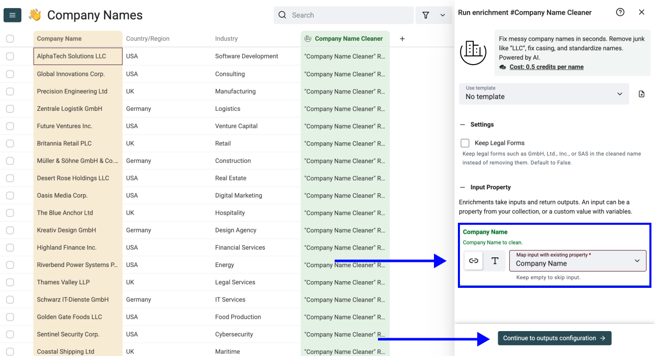- What it does: Removes legal suffixes (LLC, Inc., GmbH, etc.), corrects formatting, and standardizes company names automatically