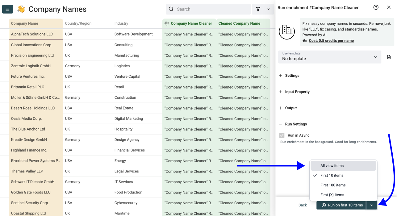 Datablist's Company Name Cleaner processes thousands of names in under 2 minutes. Upload your CSV, configure the enrichment, and run it. You'll get consistent, outreach-ready names without manual work.