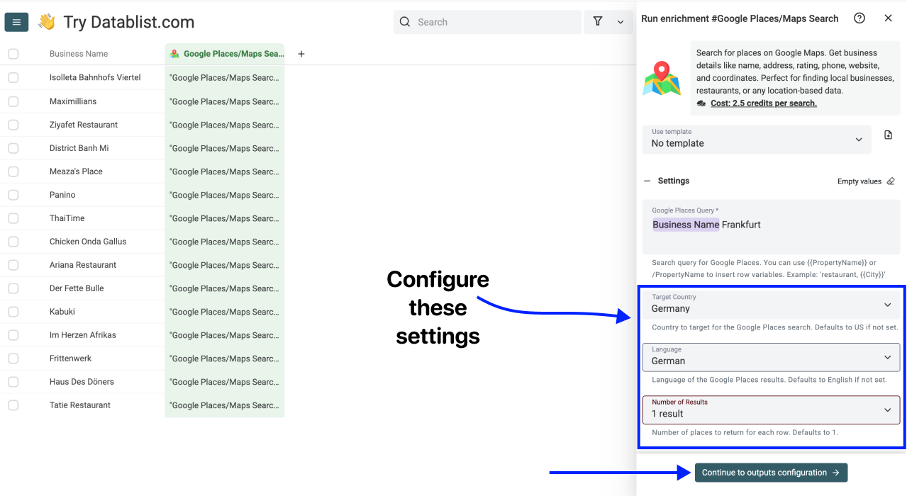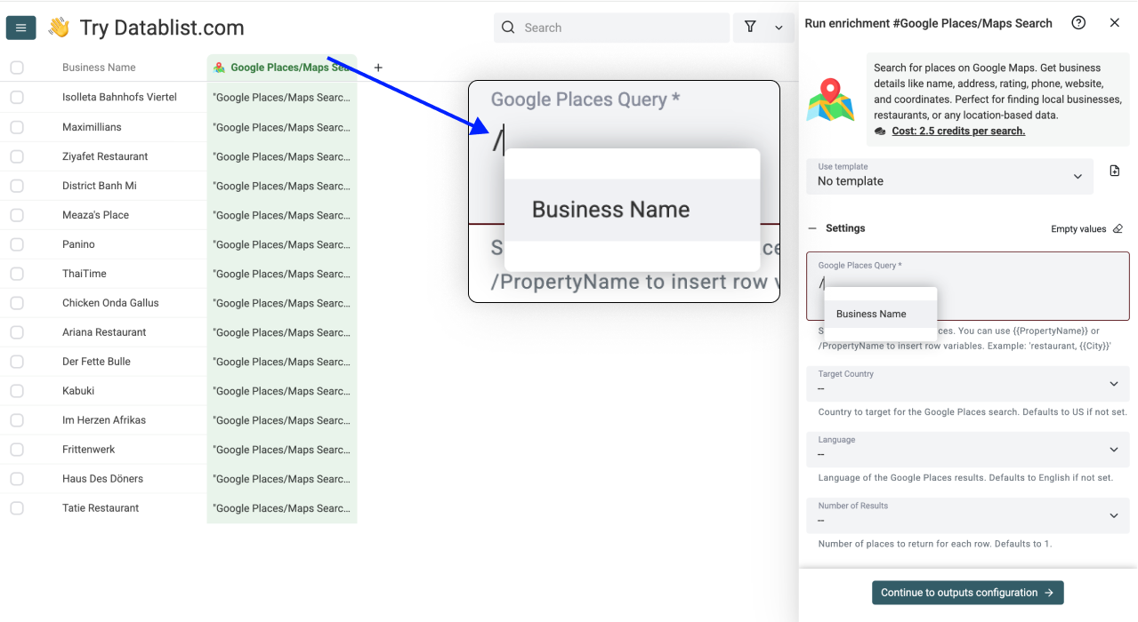 Query - Use / to insert just your business name column. Your search query will be the company name alone (e.g., "Haus Des Döners" instead of "Haus Des Döners Frankfurt")