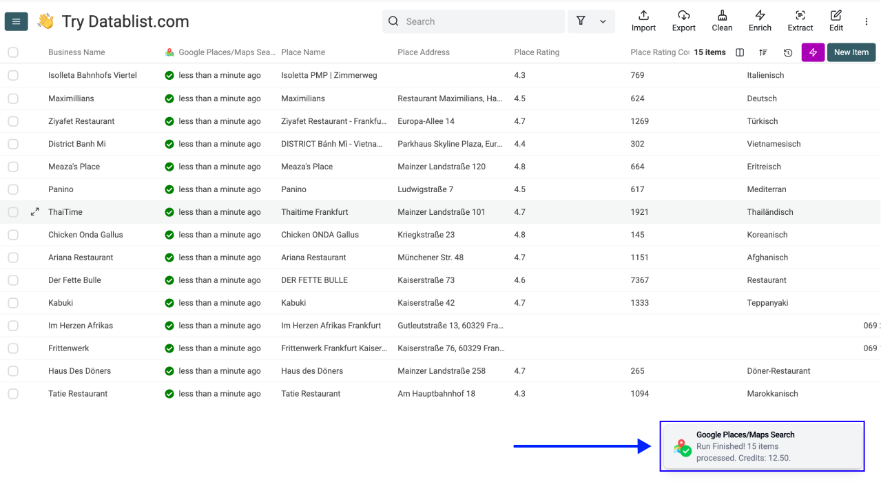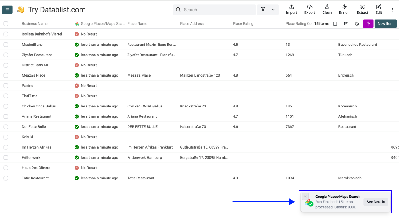 Within minutes, your collection will have full Google Maps business data for each company, i.e. You just did a bulk reverse Google Maps search without writing a single line of code.