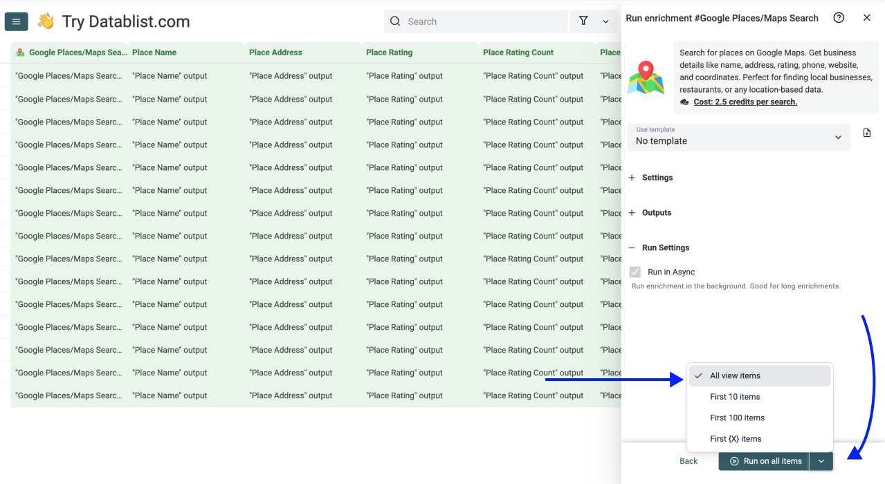 The Google Places Search enrichment costs 2.5 credits per search. With Datablist's Starter Plan ($25/month), you get 5,000 free credits monthly. That's enough for 2,000 Google Maps business lookups every month without any additional cost.