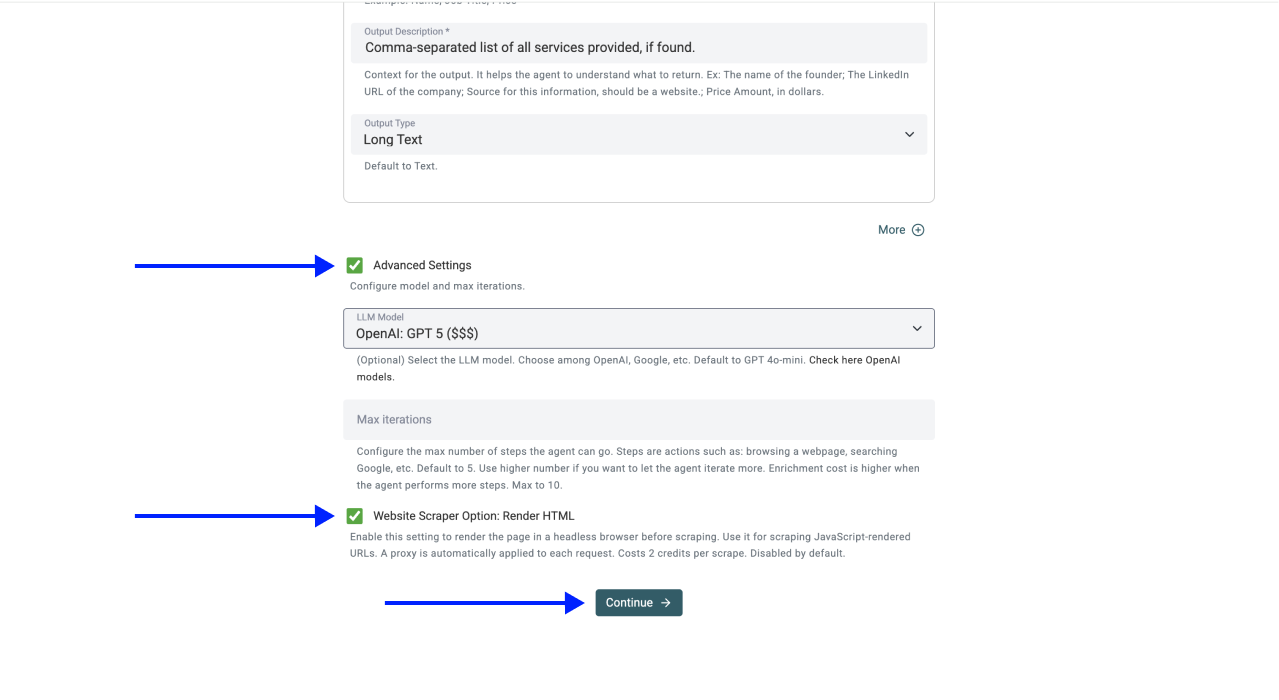 - Website Scraper Option: Render HTML (Clutch loads agency cards dynamically with JavaScript, so this setting is critical)