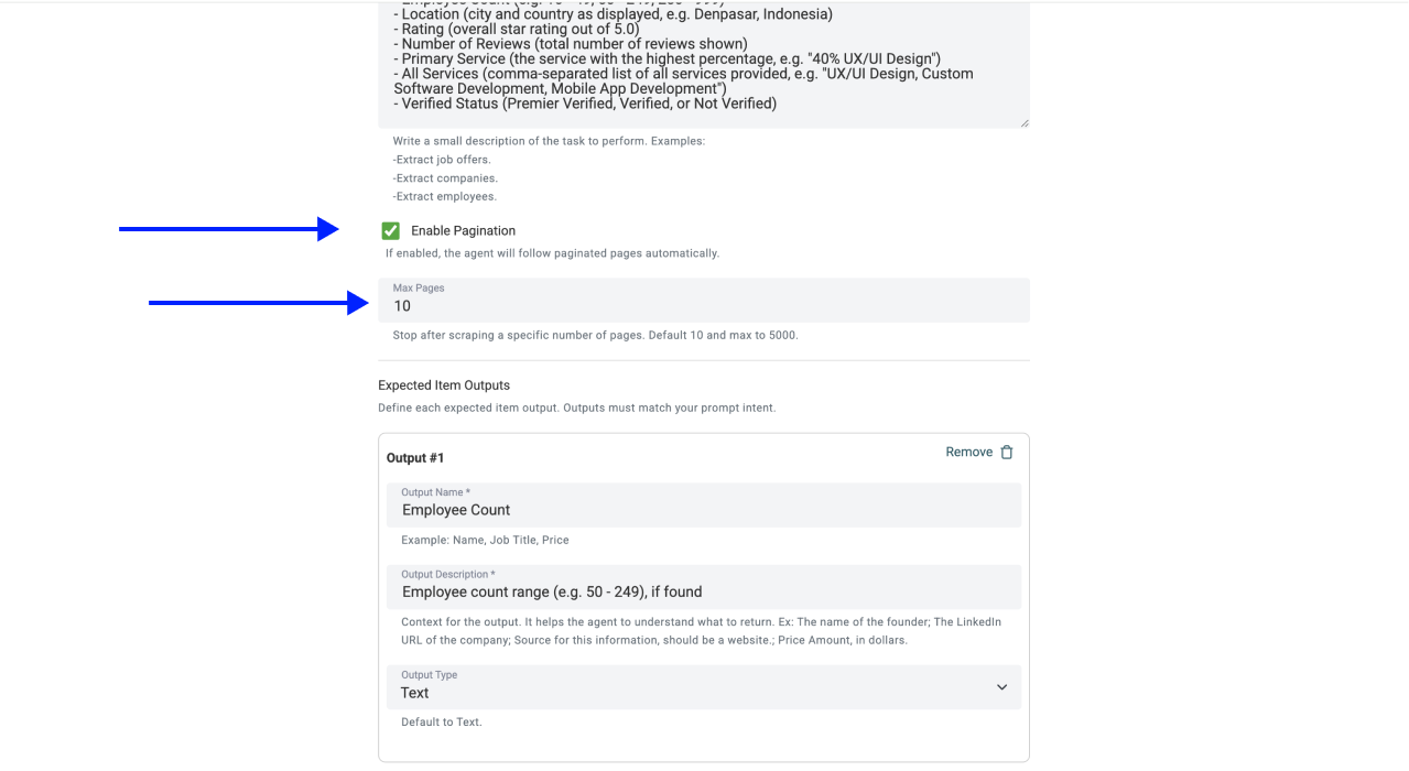 Clutch shows around 15 agency cards per page. If you're scraping "SEO agencies in London" and there are 20 pages of results, set the pagination to 20. For broader searches (e.g., all SEO agencies globally), expect hundreds of pages. Datablist's AI Scraping Agent handles pagination automatically and can scrape up to 5,000 pages in a single run.