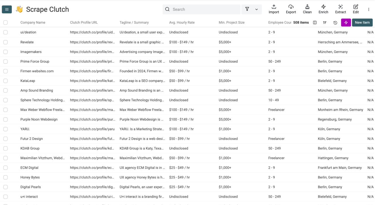 After a few minutes, your collection will be filled with Clutch agency data. From here, you can use Datablist's workflow automation features to clean, deduplicate, enrich, and export the data.