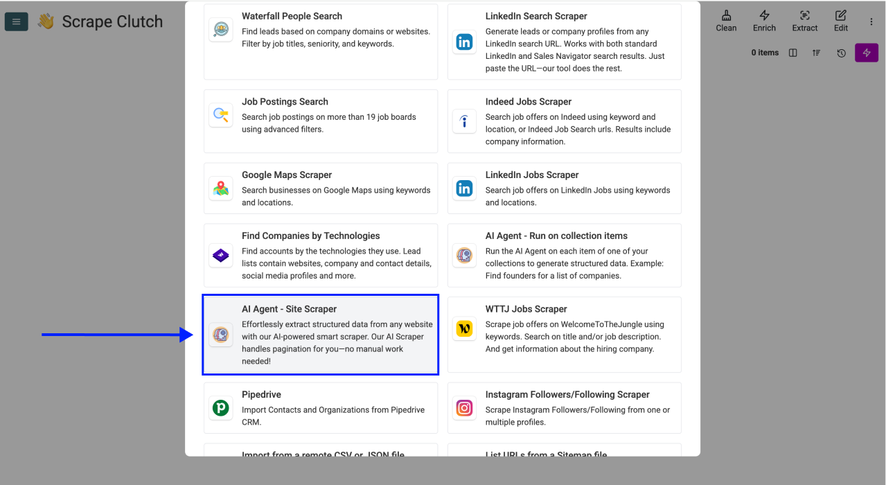 Solution: Use Datablist’s AI Scraping Agent with a ready-to-use Clutch template to extract agency leads in minutes.
