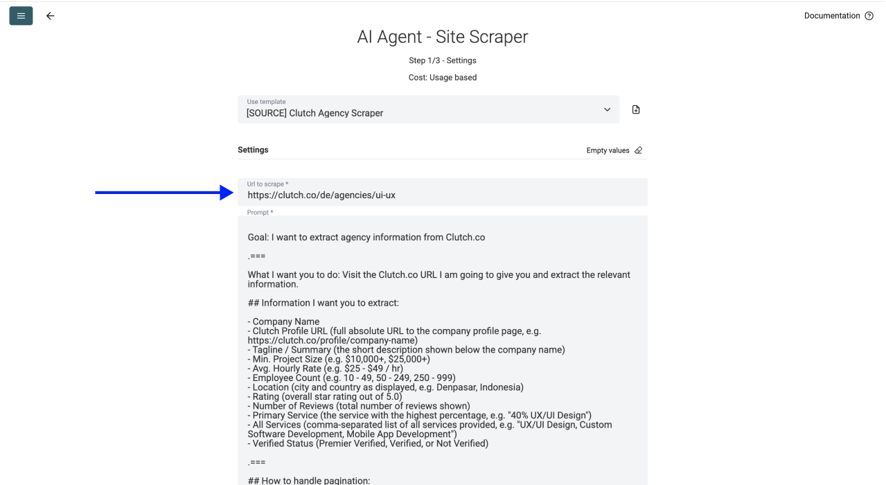 This source takes a URL and a prompt and scrapes Clutch agency listings using AI. Costs vary based on usage since the AI Scraping Agent operates on a usage-based credit system.