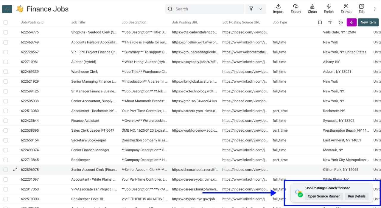 To scrape 100 finance job posts in London, Datablist takes around 5 to 10 minutes. Larger searches (500+ postings) typically complete within 15 to 20 minutes, depending on the number of filters applied.