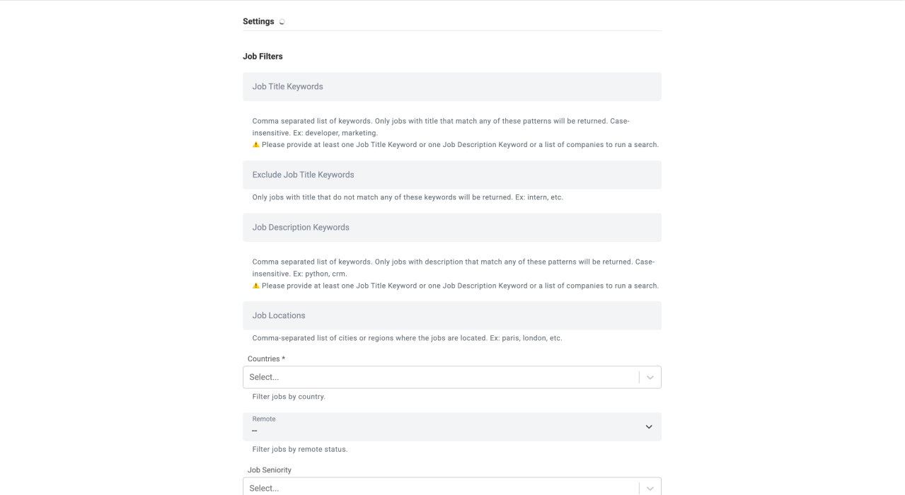 You'll see a filter interface that lets you define exactly what kind of job postings you want to scrape.