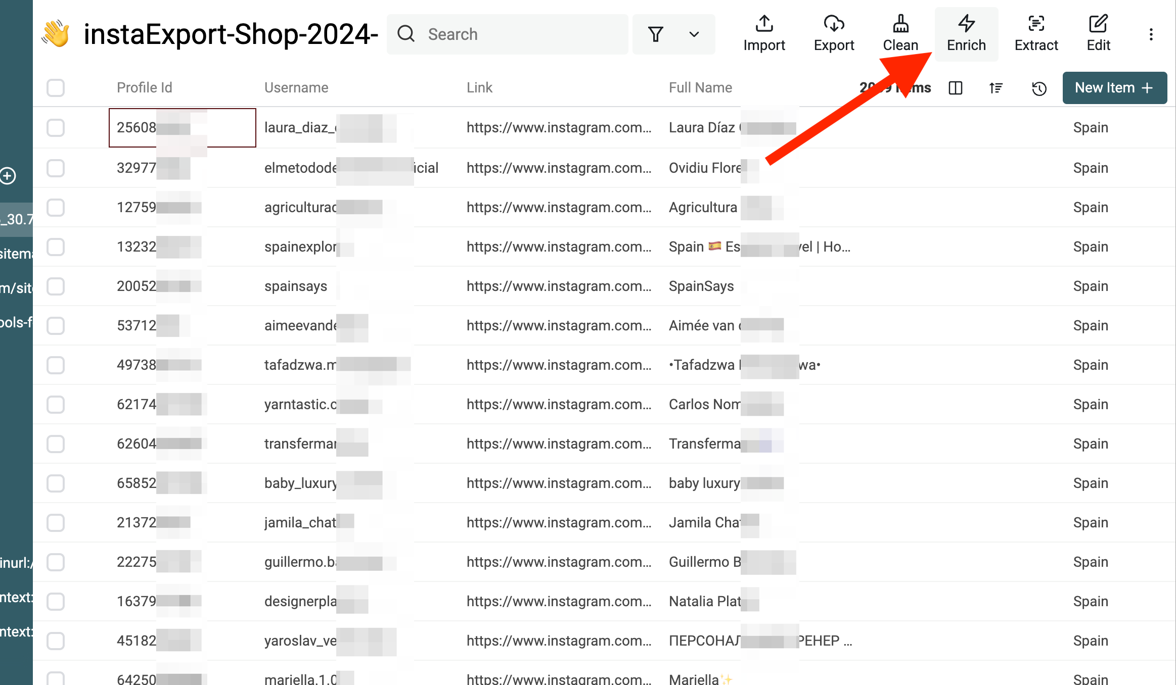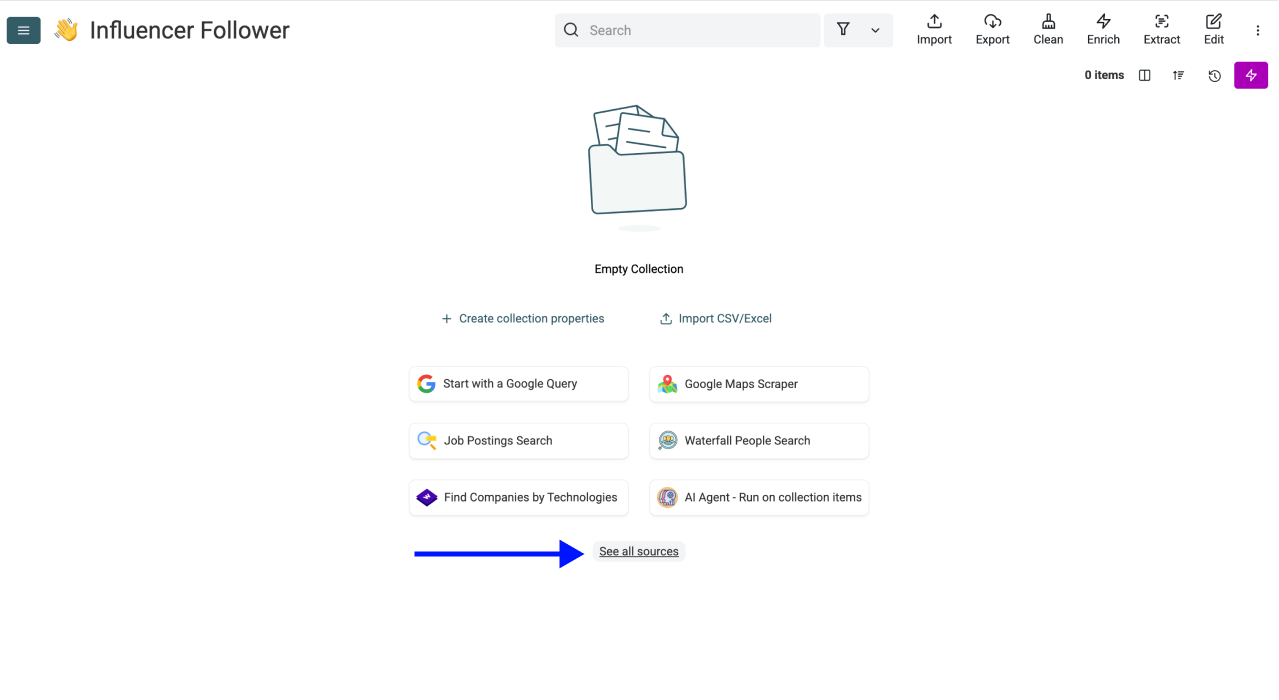 1. Access the Enrichment Menu Inside your collection with the scraped followers, click the Enrich button at the top of your dashboard.