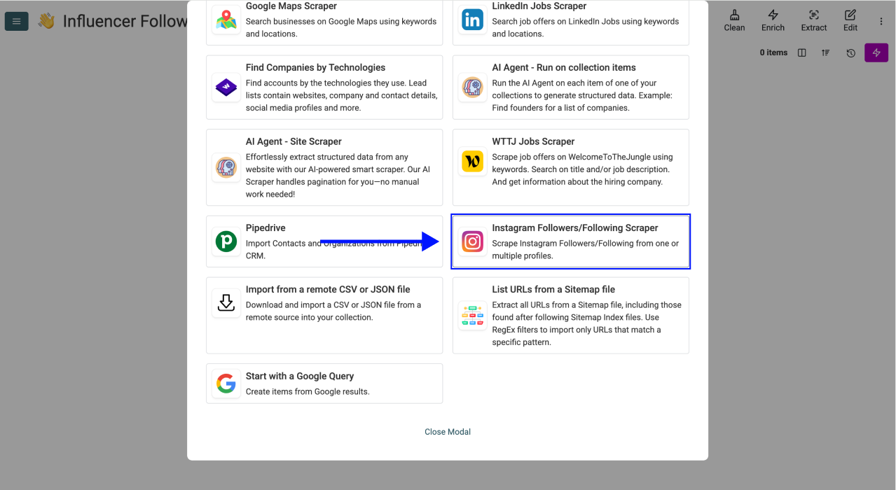 Scroll down, and select the Instagram Followers Scraper from the list.