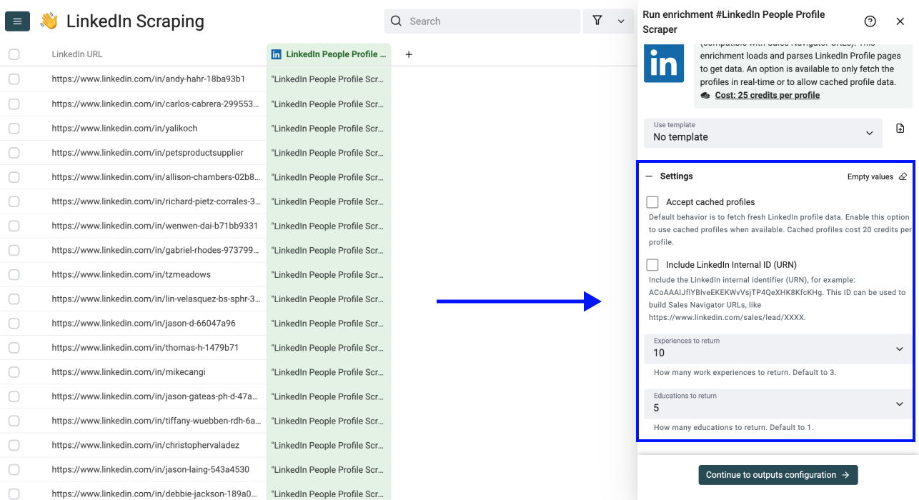 - Accept Cached Profiles (if available): Default behavior scrapes fresh LinkedIn profile data. Enable this to use cached profiles when available. Cached profiles cost 20 credits instead of 25.