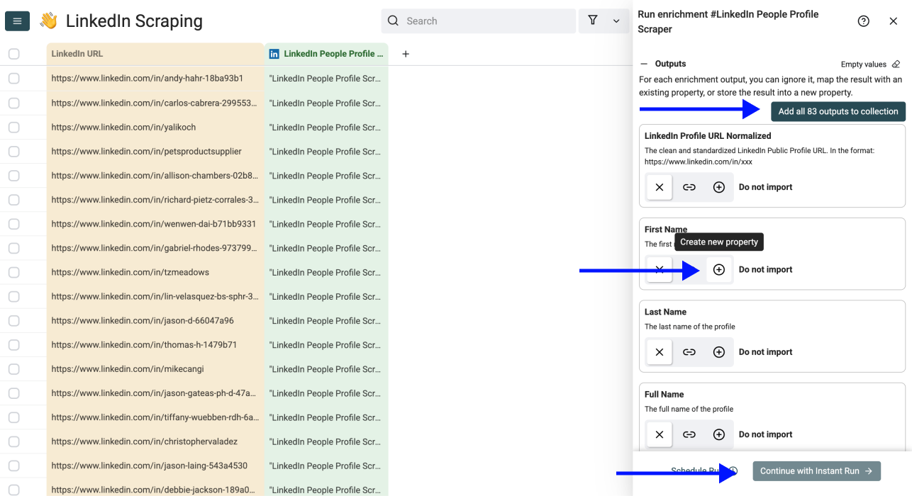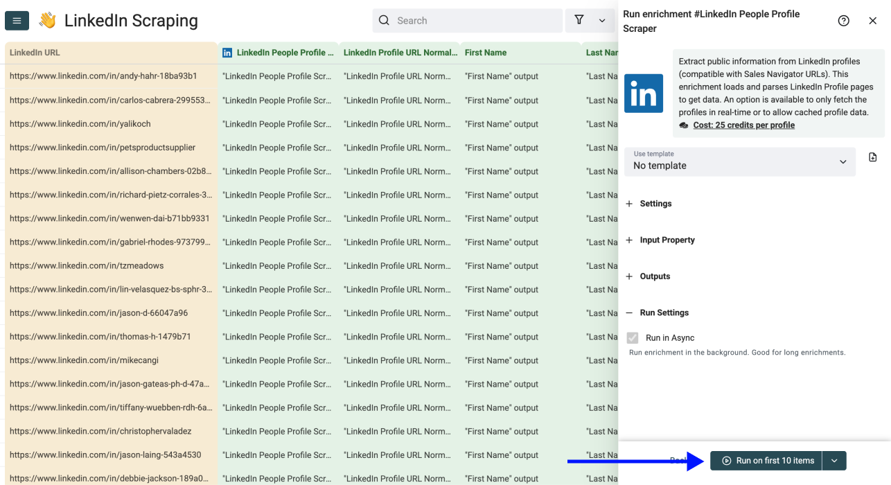 Once you’ve configured your settings, scroll down and map the column with your LinkedIn profile URLs as Input Property