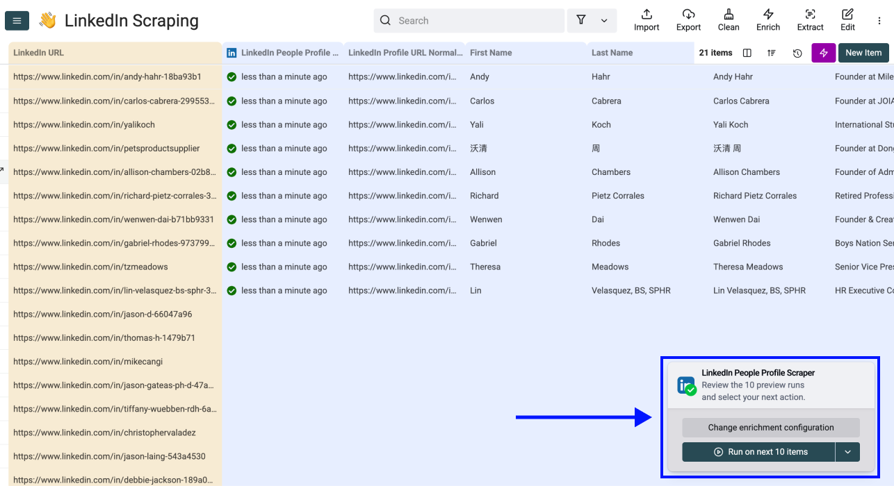 Upload your list to Datablist, select the LinkedIn Profile Scraper enrichment, configure your settings, and run. No coding required, no LinkedIn login needed. The entire workflow automation happens in a few clicks.