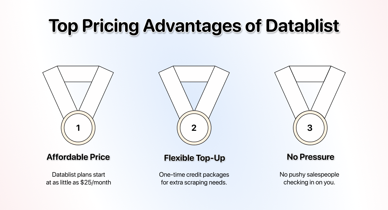 The cost depends on the tool you use. Since you get 5,000 free credits for each month you're subscribed to Datablist, you can start scraping for as little as $25/month. The AI Agent, like all other tools in Datablist, runs on credits and is usage-based. For example, to scrape 300 products and founder details from Product Hunt 1500-2000 credits
